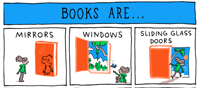 “Books are sometimes windows, offering views of worlds that may be real or imagined, familiar or strange. These windows are also sliding glass doors, and readers have only to walk through in imagination to become part of whatever world has been created or recreated by the author. When lighting conditions are just right, however, a window can also be a mirror. Literature transforms human experience and reflects it back to us, and in that reflection we can see our own lives and experiences as part of a larger human experience. Reading, then, becomes a means of self-affirmation, and readers often seek their mirrors in books.”