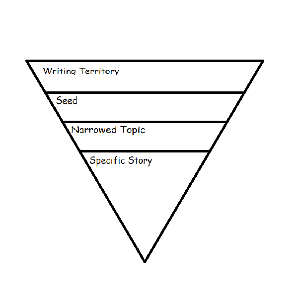 As you can see, while these topics have specific meaning to me, they are relatable to any writer. It is those specific seeds we find from our writing territories that we choose to write about. Once we have some writing territories to utilize up our sleeves, we must narrow our topic down to tell a special and unique story. Dorfman and Cappelli refer to an inverted triangle graphic organizer (p. 51-52) writers can use to narrow a chosen territory, zooming in on the one story they plan to write about on one particular day.