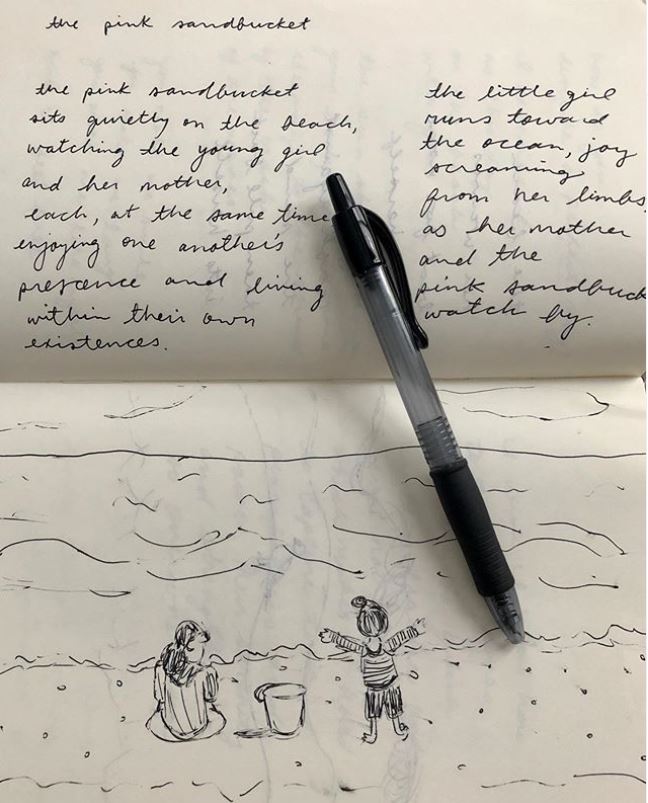 the pink sandbucket sits quietly on the beach, watching the young girl and her mother, each, at the same time, enjoying one another's presence and living within their own existences. the little girl runs toward the ocean, joy screaming from her limbs, as her mother and the pink sandbucket watch by.